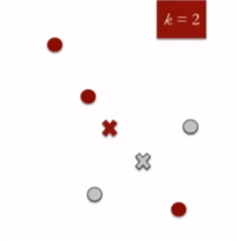 - Cluster centroids must then be computer: The centroid of data points in the grey cluster using grey cross and those in the red cluster is shown using red cross.