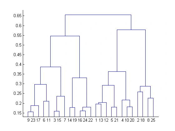 At the bottom, we begin with 25 data points assigned to separate clusters. The two closest clusters are merged until one cluster remains at the top. The height at which two clusters are merged in the dendrogram represents the distance between two clusters in the data space. The number of clusters that best depict different groups can be chosen by observing the dendrogram. The best choice for the number of clusters is the number of vertical lines in the dendrogram cut by a horizontal line which can transverse the maximum vertical distance without intersecting a cluster.