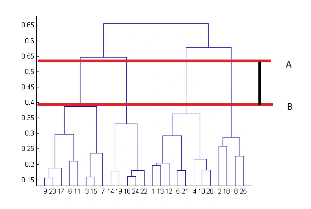 In the example above, the best number of clusters will be four, as the horizontal red line in the dendrogram below covers maximum vertical distance AB.